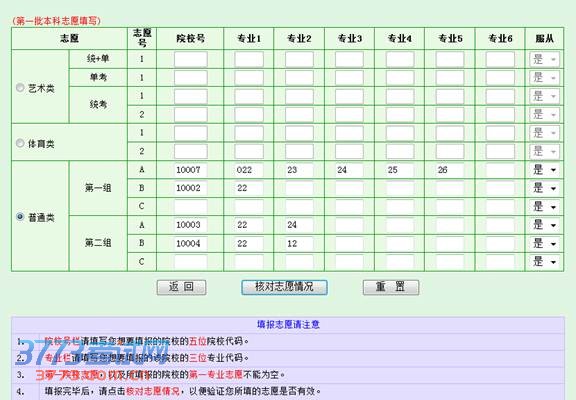 考生可以选择填报各个批次的志愿,输入院校号和专业代码(注意:在输入数字时必须按半角输入)。然后点击“核对志愿情况”按钮,系统会核对刚才所填的志愿是否符合专业目录的要求,页面如下(以填报“第一批本科”为例):