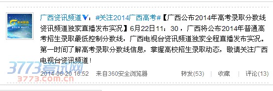 广西资讯频道:#关注2014广西高考#【广西公布2014年高考录取分数线 资讯频道独家直播发布实况】6月22日11:30