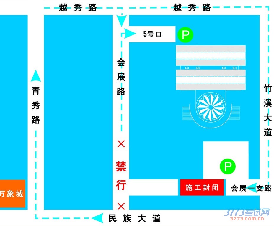 (二)从民族大道方向前往会展中心的,可绕行青秀路、越秀路,转入会展路,从5号口进入停车场。