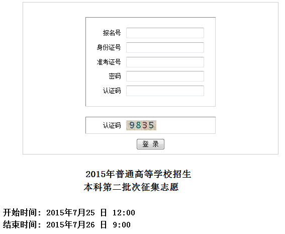 3773高考网 广西本科第二批次征集志愿工作将于7月25日12:00开始,截止时间为7月26日9:00。届时汇总的计划缺额信息将在广西招生考试网(http://www.gxeea.cn)的“普通高考—招生信息”、“通知公告”栏目中公布,考生可以登录了解到参加此次征集志愿的院校及专业的详细情况,并在规定时间内进入“2015年普通高考志愿填报系统”填报征集志愿。以下是志愿填报入口: