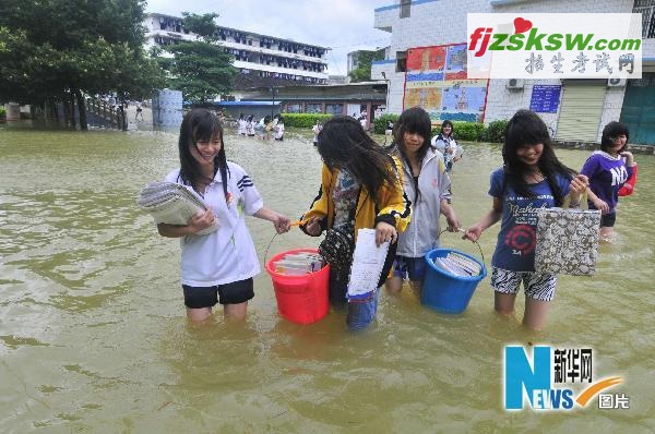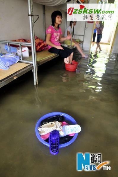 6月2日,在高三女生宿舍,同学们用桶和盘装拖鞋,防止拖鞋漂走。 新华社记者 黄孝邦摄