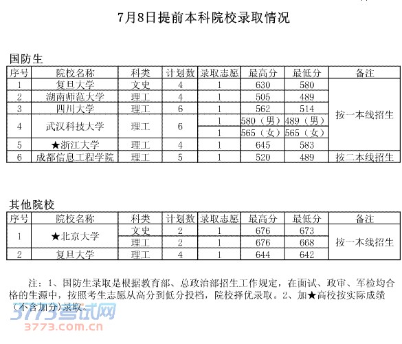 7月8日提前本科院校录取情况 2014年7月8日贵州提前本科院校录取分数线