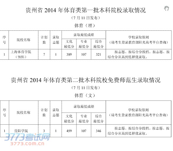 [图文]2014年7月11日贵州高考体育类院校录取情况