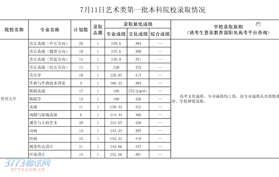 [图文]2014年7月11日贵州艺术类一本院校录取分数线