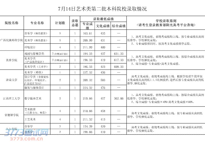 [组图]2014年7月14日贵州艺术类二本院校录取分数线