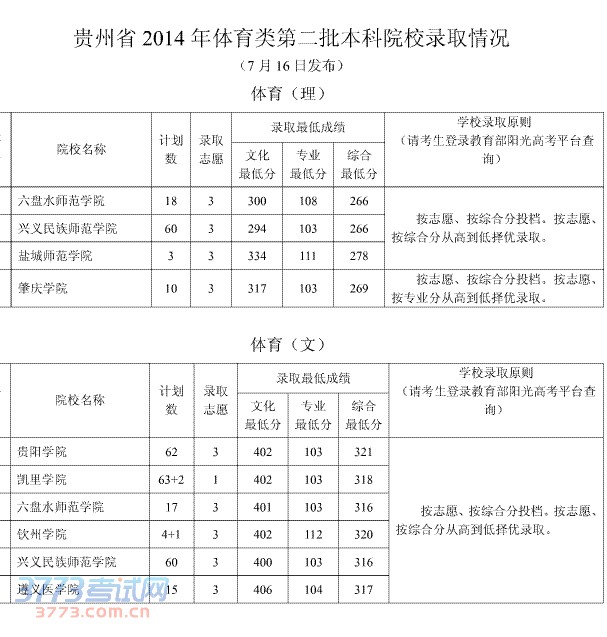 [图文]2014年7月16日贵州体育类二本院校录取情况