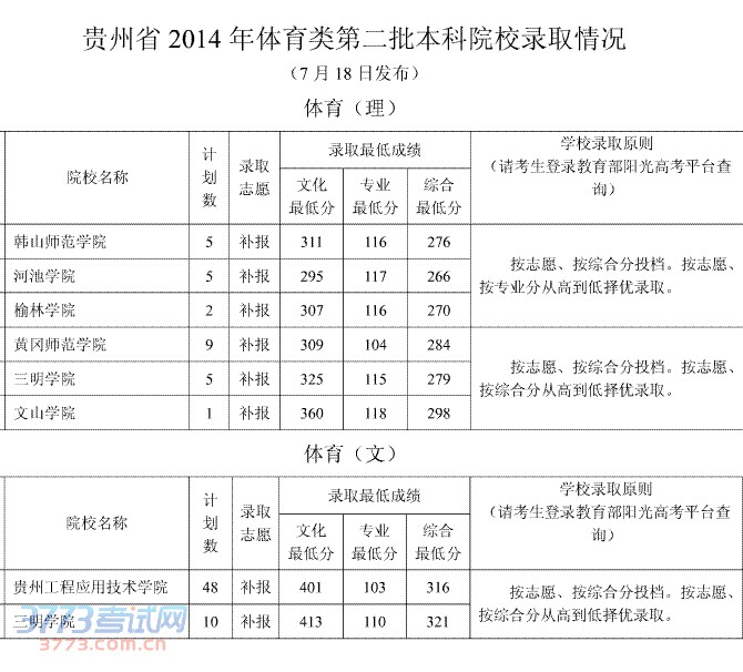 贵州省2014年体育类第二批本科院校录取情况(7月18日发布)