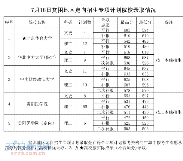 7月18日贫困地区定向招生专项计划院校录取情况