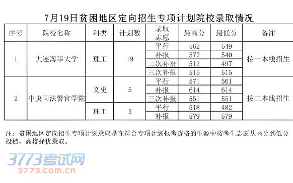 7月19日贫困地区定向招生专项计划院校录取情况