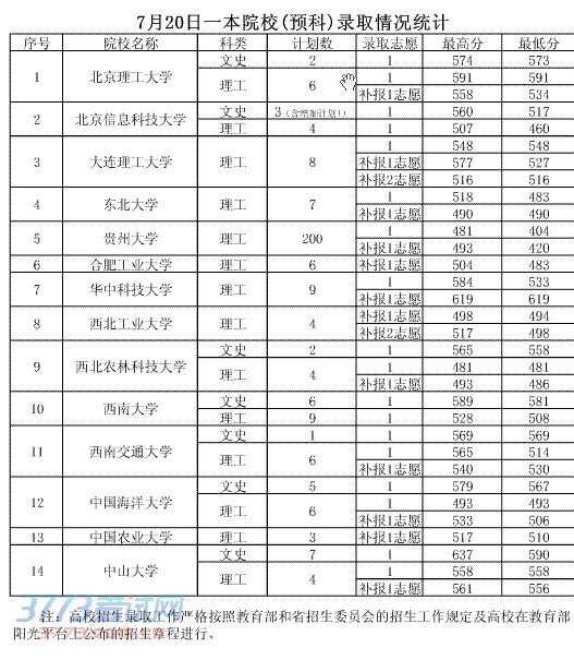 [图文]2014年7月20日贵州高考一本院校预科录取分数线