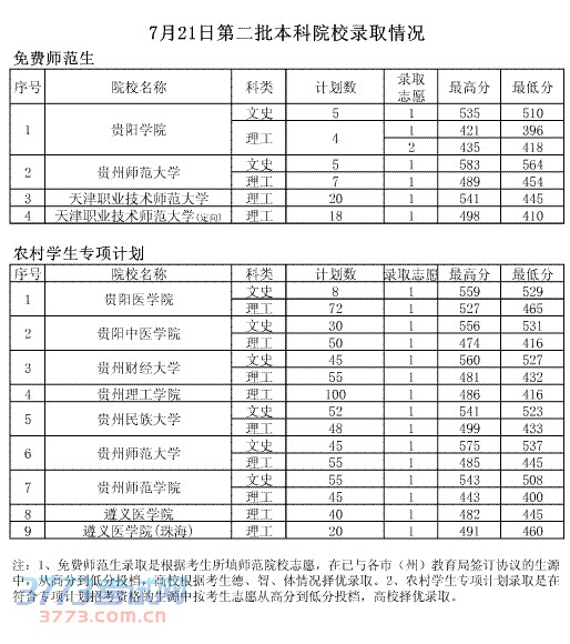 [图文]2014年7月21日贵州高考二本院校录取分数线