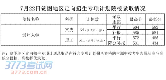 7月22日贫困地区定向招生专项计划院校录取情况