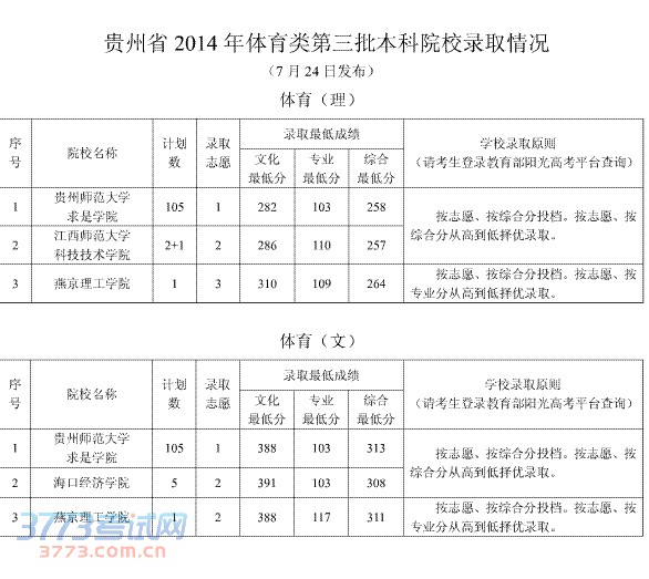 [图文]2014年7月24日贵州体育类三本院校录取分数线