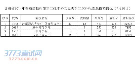 贵州省2014年普通高校招生第二批本科文史类第二次补报志愿投档情况(7月26日)
