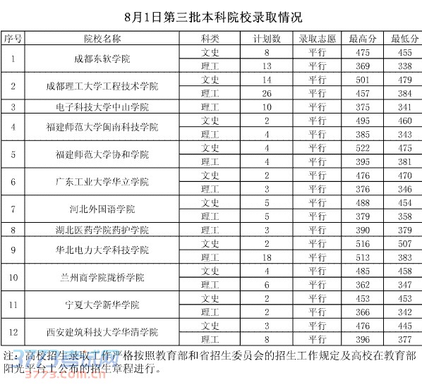 [图文]2014年8月1日贵州高考三本院校录取分数线