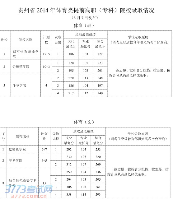 贵州省2014年体育类提前高职(专科)院校录取情况(8月7日发布)