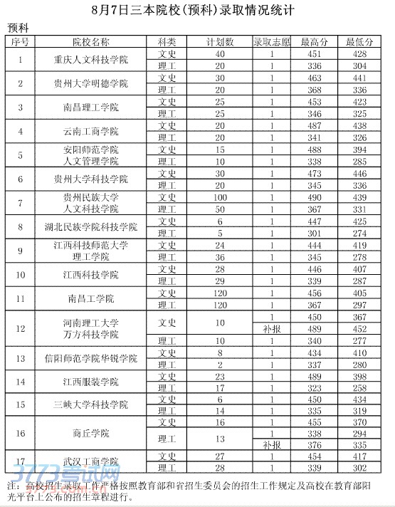 [图文]2014年8月7日贵州高考三本院校(预科)录取分数线