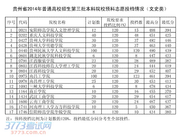 [图文]2014贵州高考三本预科文科院校投档分数线
