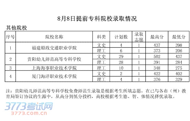 [图文]2014年8月8日贵州高考提前专科院校录取情况