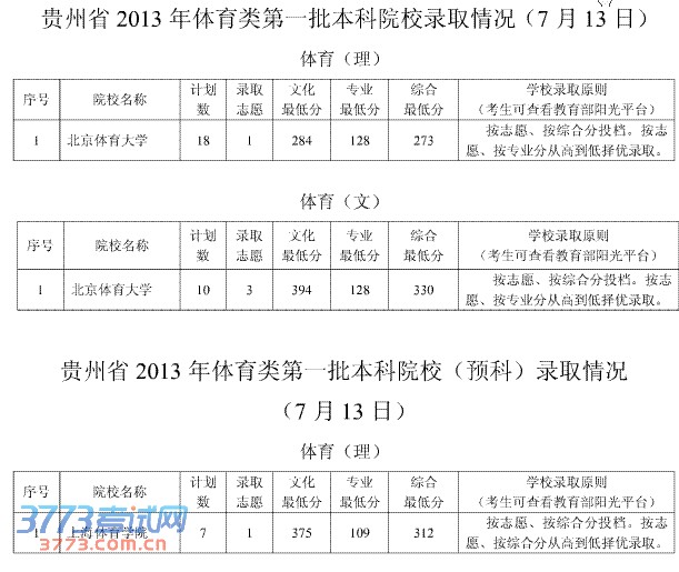 [图文]贵州省2013年体育类一本院校录取分数线(7月13日)