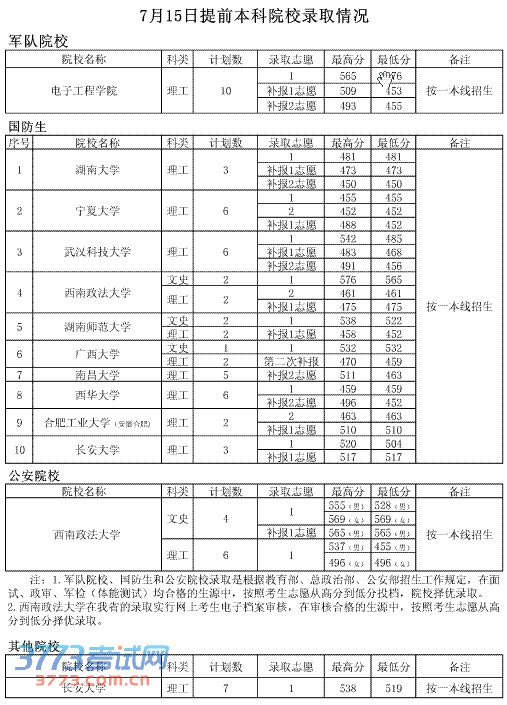 7月15日提前本科院校录取情况7月15日提前本科院校录取情况