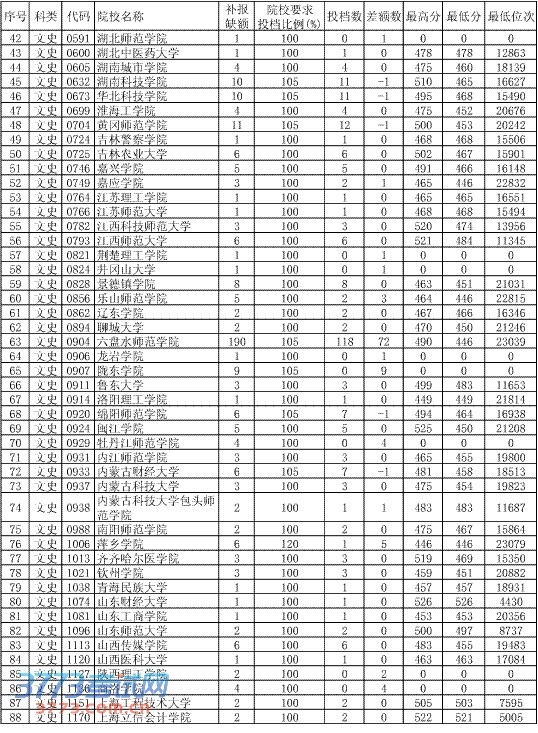 贵州省2013年高考第二批本科补报志愿文史类平行志愿投档情况(7月26日)
