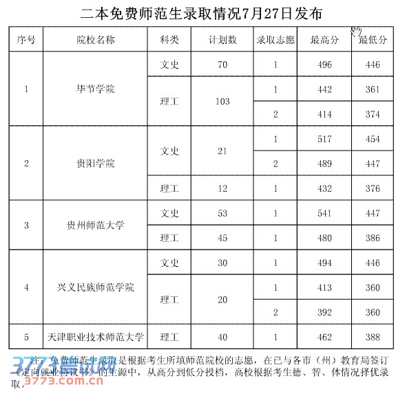 [图文]2013年7月27日贵州高考二本免费师范生录取分数线