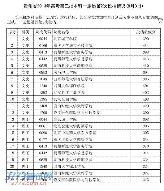 [图文]2013年8月3日贵州三本院校第2次投档分数线