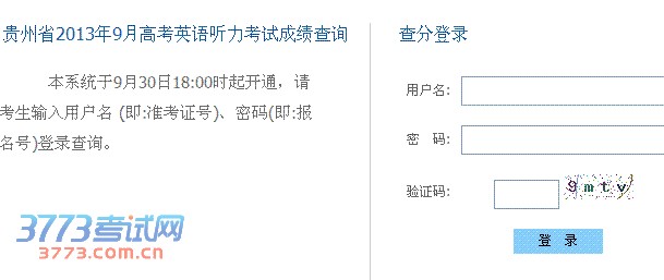 2013年9月高考英语听力考试成绩于9月30日公布,考生可登陆省招生考试院网站(网址:http://cjcx.gzszk.com),输入用户名(即准考证号)和密码(即报名号)查询成绩。