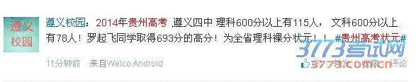 2014年贵州高考成绩查询入口已经开放,据报道,遵义四中罗起飞同学以693分成绩摘获2014年贵州理科状元!