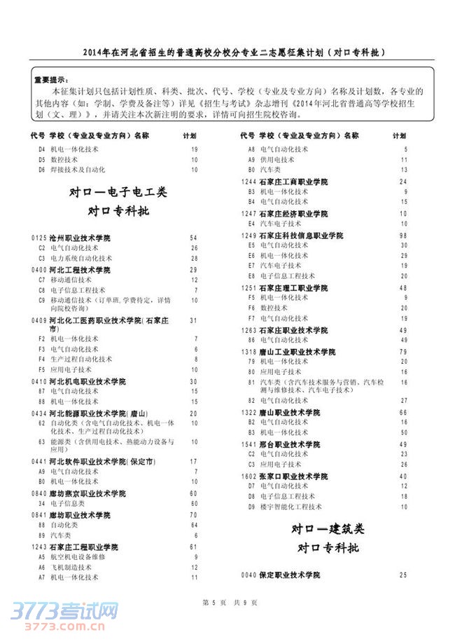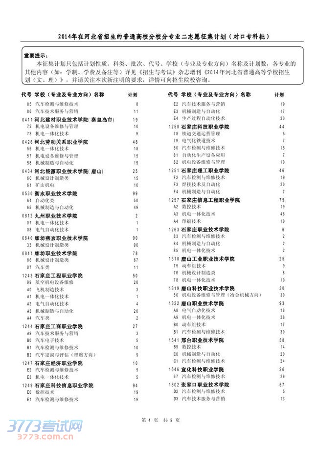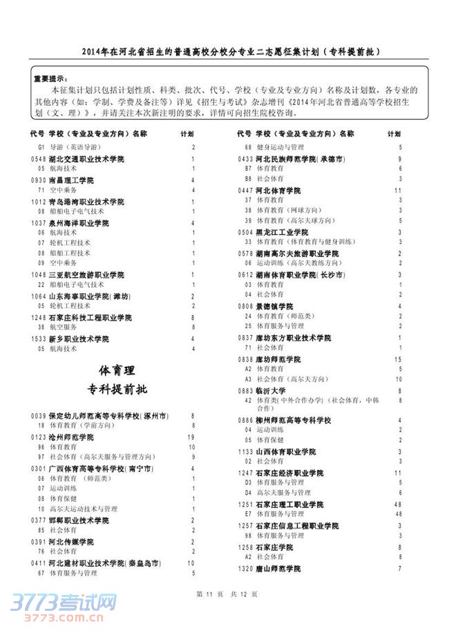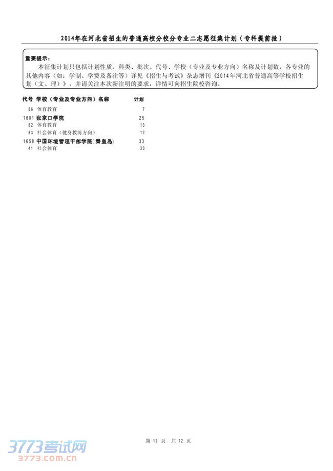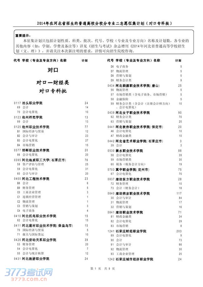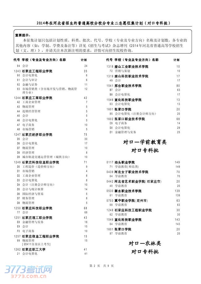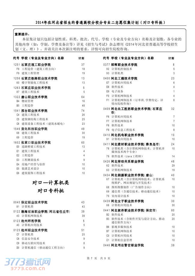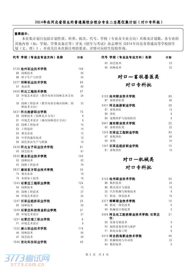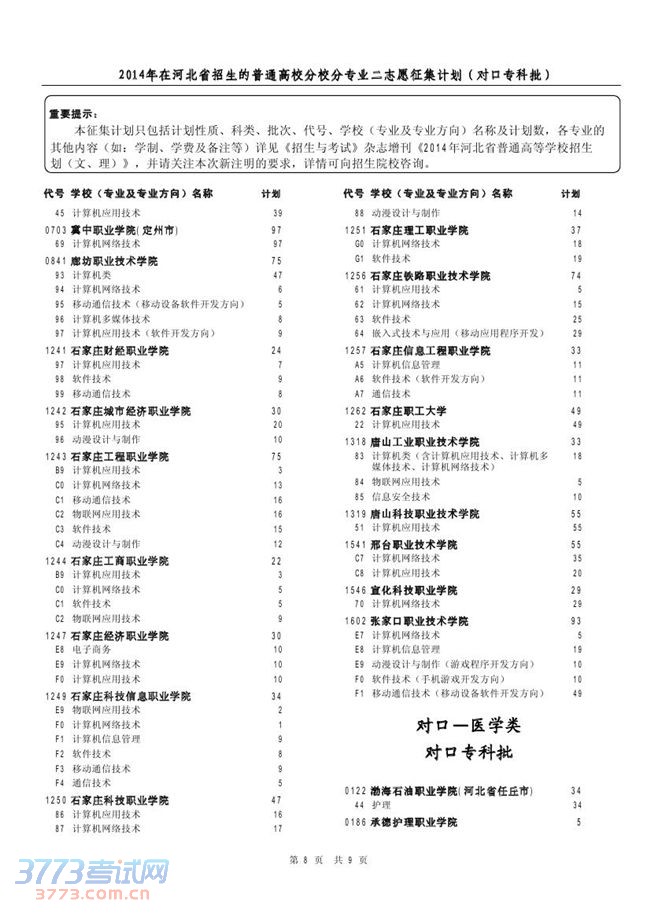 [组图]2014河北专科提前批对口专科批二志愿征集计划