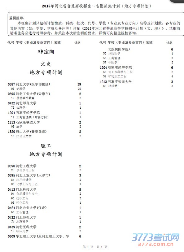 2015年河北省普通高校招生二志愿征集计划(地方专项计划)