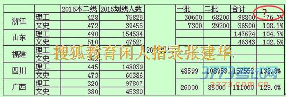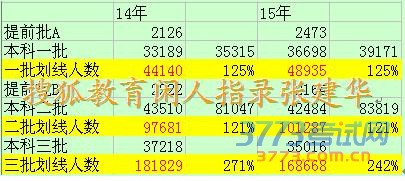 我们推算一下:假如15年河北省实行批次合并,按照计划数125%划线,则划线人数约153800人,控制线372(实际划线168668人,控制分数线335)省内约15000人失去竞争本科机会,分数线提高近40分。