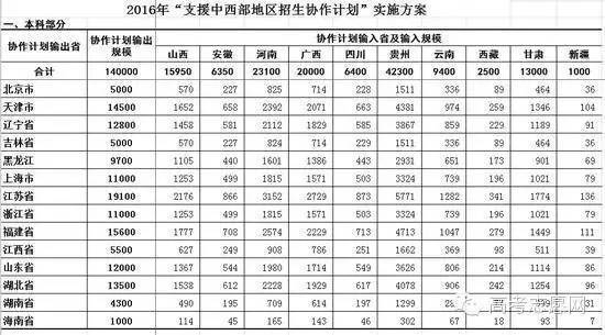 2016年“支援中西部地区招生协作计划”实施方案