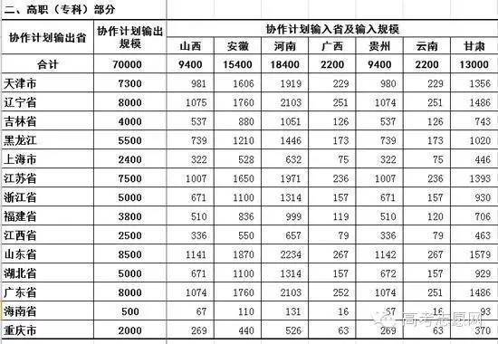 《通知》提出要促进高等教育区域和城乡入学机会公平。2016年,支援中西部地区招生协作计划安排21万人,其中本科14万人,由北京、天津、江苏等14个省(市)的公办普通高校承担,面向河南、广西、贵州、甘肃等10个中西部省(区)招生。国家贫困地区定向招生专项计划安排6万人,由中央部门和地方 “211工程”学校为主的本科一批招生高校承担。地方重点高校招收农村学生专项计划由各省(区、市)在本科一批招生的本地省属高校承担,招生计划原则上不少于有关高校本科一批招生规模的3%。重点高校农村学生单独招生计划由教育部直属高校和其他自主招生试点高校承担,招生计划不低于有关高校年度本科招生规模的2%。高等教育资源丰富、2016年升学压力较小的上海、江苏、浙江、福建等省(市),应在上年常规跨省生源计划和2016年协作计划的基础上,进一步增加面向部分中西部省(区)的生源计划。