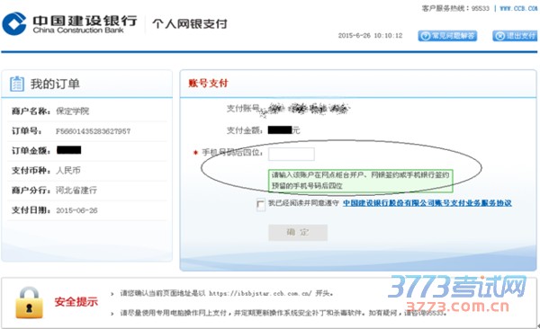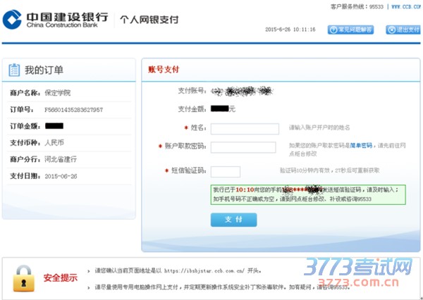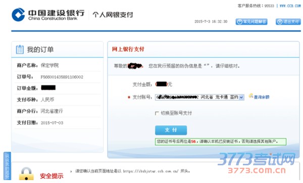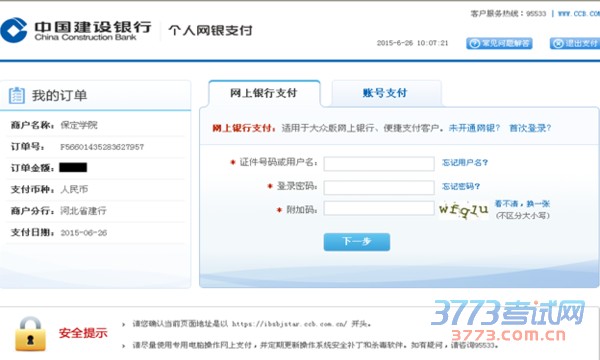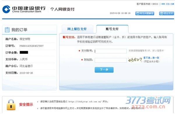 完成以上操作后,点击“下一步”,页面显示建设银行个人网银支付界面,此时提供两种方式支付:网上银行支付和账号支付。已办理网银业务的可用两种方式缴费,未办理网银业务的只可用账号支付缴费。