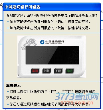 第四步,核对网银盾屏幕中显示的信息是否正确,如果正确点击网银盾的“确认”按键完成交易。