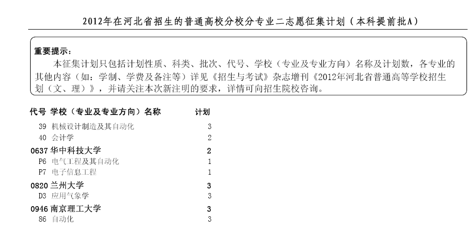 二、本征集计划只包括计划性质、科类、批次、代号、学校(专业及专业方向)名称及计划数,各专业的其他内容(如:学制、学费及备注等)请见《考试与招生》杂志增刊《2012年河北省普通高等学校招生计划(文、理)》,务请关注本次新注明的要求,详情可向招生院校咨询。