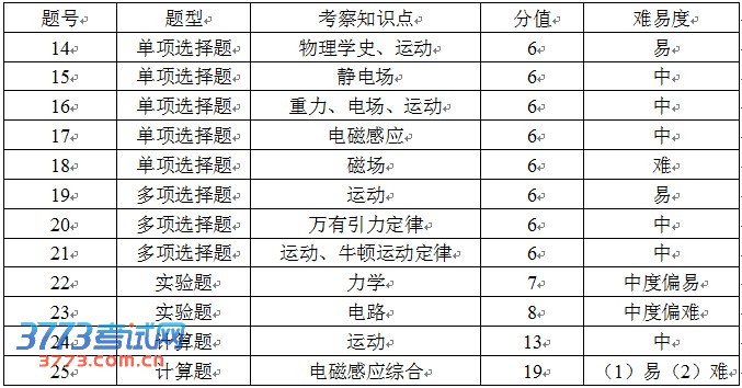 24:计算题。涉及电磁感应及动力学结合的综合试题。第(1)问较易,容易得分。第(2)问要搞清楚金属棒的运动性质,证明出金属棒做匀加速直线运动才能求解。估计没有练过的考生很难想到。此题是竞赛题改编而来,有一定的区分度,估计考生的得分率不会太高。