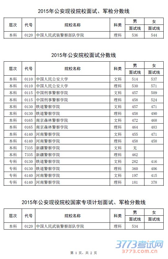 2015年河南省普通高招公安及公安现役院校面试分数线