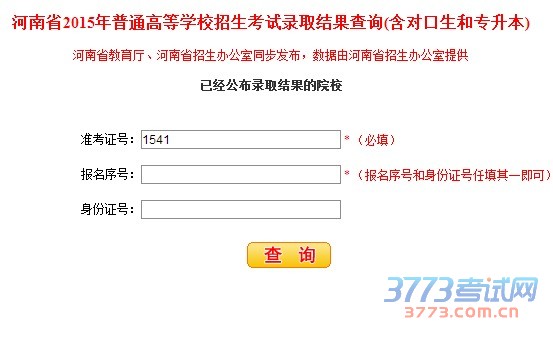 河南省2015年普通高等学校招生考试录取结果查询(含对口生和专升本)