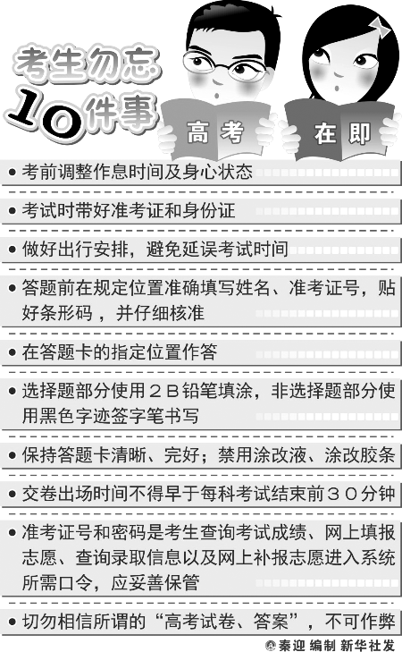 同时,县级招办和中学还将张榜公示各类享受政策性照顾的考生名单,并公布本级和上级举报电话。省招办特别提醒考生,考试期间各考点均公布省、市、县三级举报电话。省招办举报电话:0371—68101503。(记者田明)