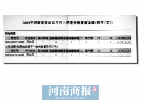 郑观洲表示,数学成绩只有1分,这个得分非常奇怪。只要客观题(选择题)得零分的考卷,评卷中一定会做出详细的复核。而据他了解,在评卷过程中,邢如风的1分考卷就曾备受关照,“共有9位教师参与了该卷的评阅和复核”。
