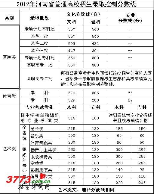 6月24日下午4点,省招生办公室公布了2012年河南省普通高招录取控制分数线。其中,文科一本分数线为557分,理科一本分数线为540分。