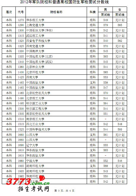 [组图]2012年河南军队院校和普通高校国防生军检面试分数线