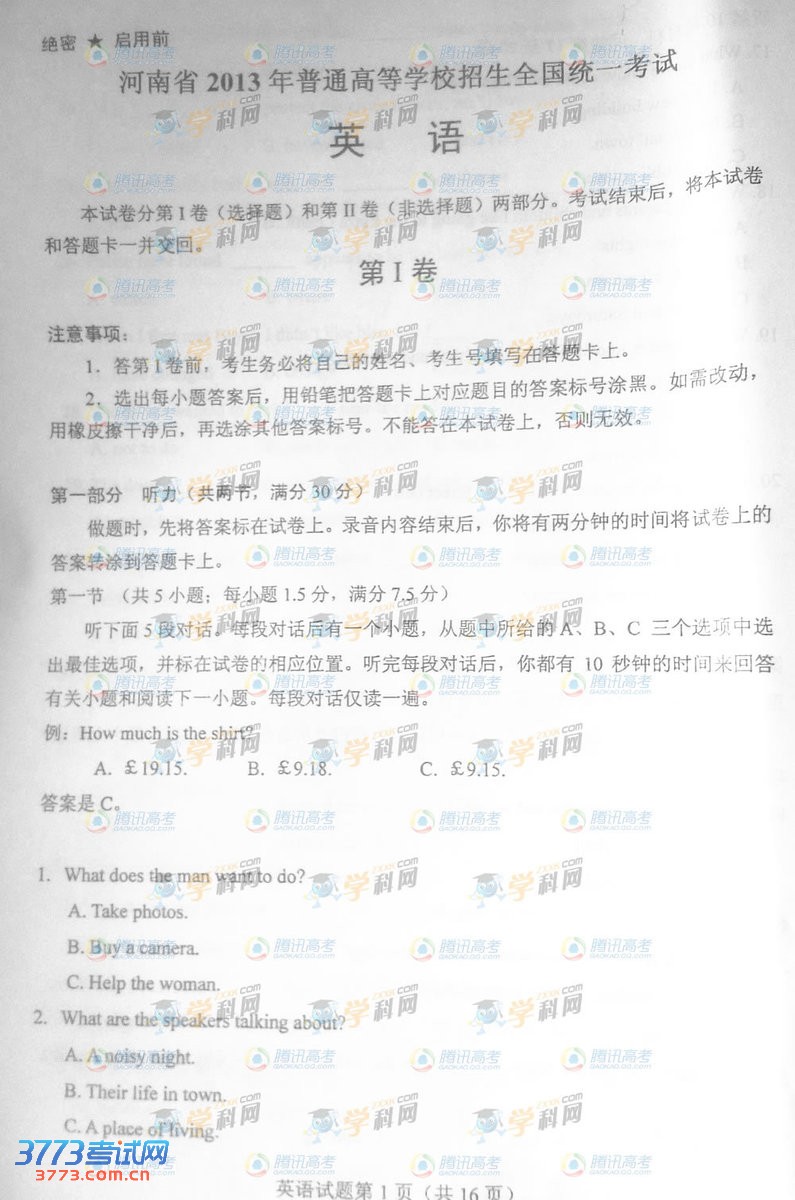 [组图]2013河南高考新课标全国1卷英语试题