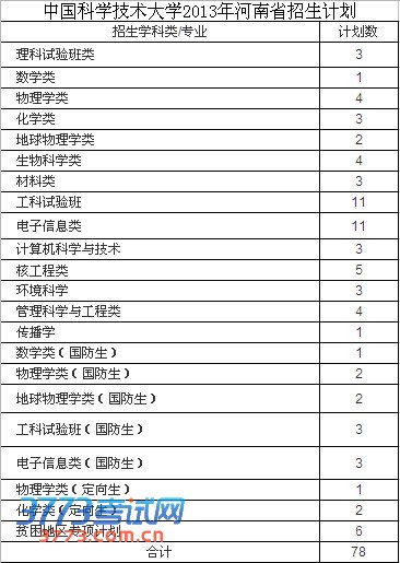 大河网讯(记者 许会增)6月11日,记者从中国科学技术大学获悉,中国科学技术大学2013年在河南省计划招生78人,比去年增加4人。“河南省是我校的生源大省,我校在河南省每年都有扩招。”中国科学技术大学河南招生组组长何克东说。