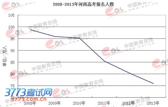 3773考试网河南地区高考志愿填报指南数据显示,2008年河南高考报名人数为98.8万人,创历史新高,从2009年起,高考人数开始下降,2009年为95.9万,2010年95.24万,2011年85.5万,2012年80.5万。