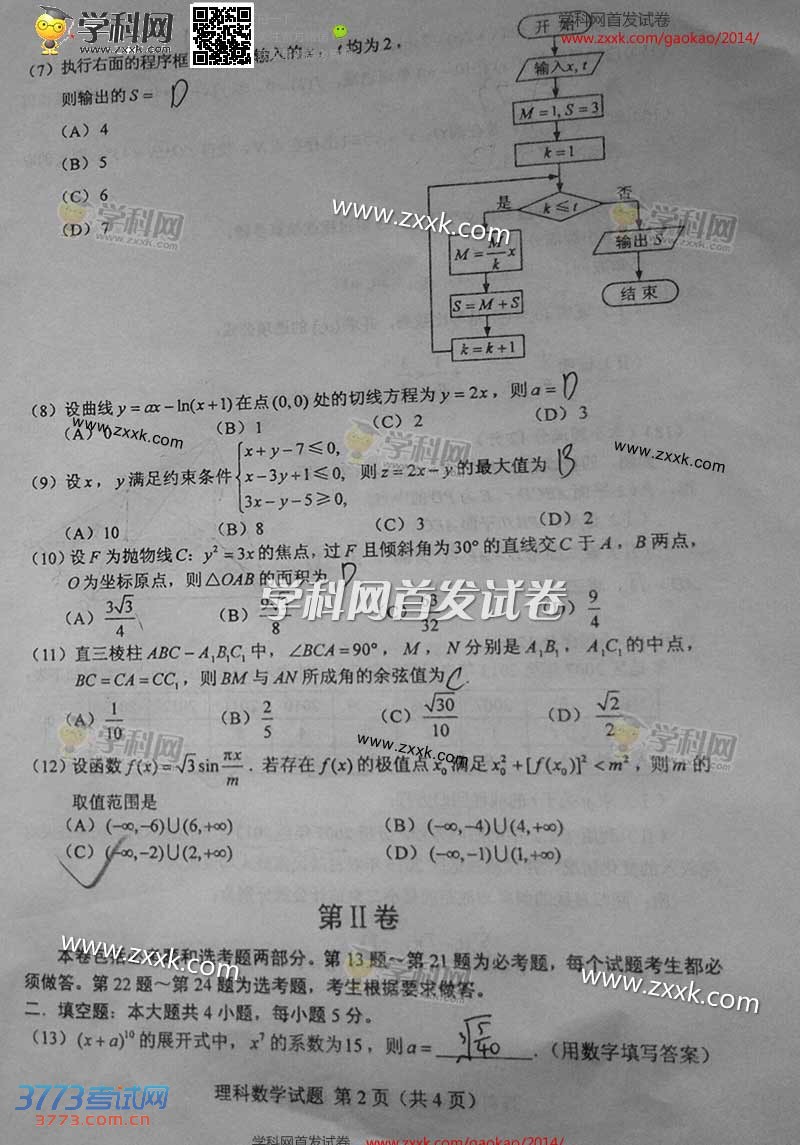 [组图]2014全国高考新课标2卷数学理科试题及部分答案
