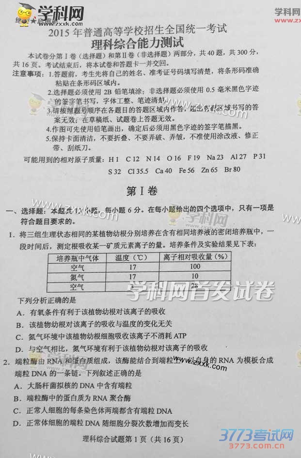 2015年新课标2理科综合高考试题及答案 适用地区:贵州 甘肃 青海 西藏 黑龙江 吉林 宁夏 内蒙古 新疆 云南 辽宁 广西